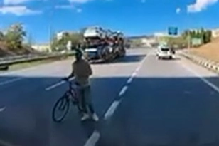 Olay, Bursa-Yalova yolu üzerinde meydana geldi. Hızla ilerleyen araçlar, karşısında bisikletli vatandaşı görünce ne yapacağını şaşırdı. Kamyonların ve otomobillerin arasında sahilde yürürcesine ilerleyen bisikletli kişinin o anları bir otomobilin araç içi kamerasına yansıdı.