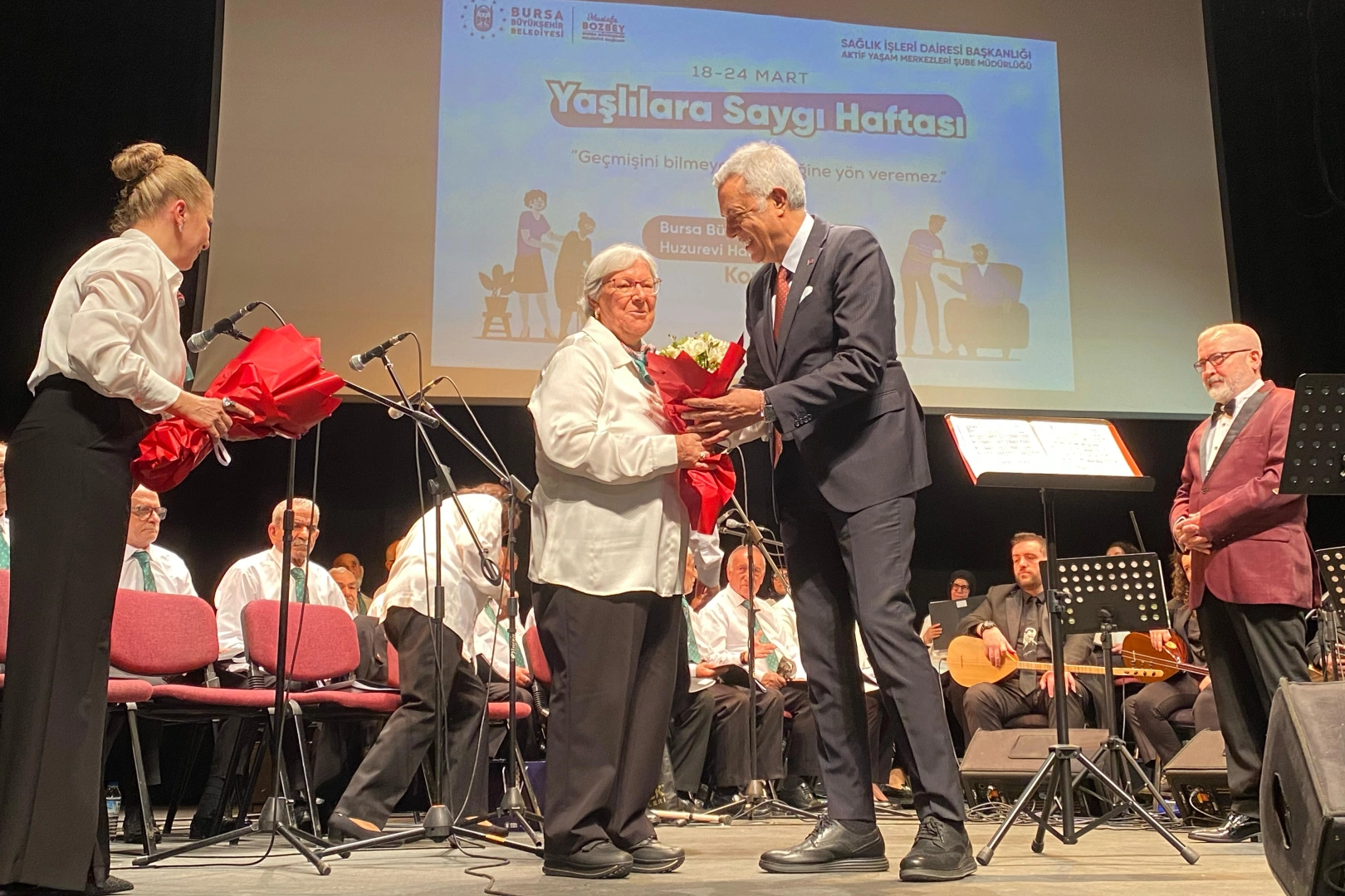 18-24 Mart tarihleri arasında kutlanan Yaşlılara Saygı Haftası kapsamında Bursa Büyükşehir Belediyesi Sağlık İşleri Dairesi Başkanlığı Aktif Yaşam Merkezleri Şube Müdürlüğü tarafından çeşitli etkinlikler düzenlendi. Heykel Atatürk Anıtı’na çelenk sunumu ile başlayan programlar, Tayyare Kültür Merkezi’ndeki sergi ve konserle devam etti. Huzurevi sakinlerinin hazırladığı eserlerin yer aldığı serginin açılışına, Büyükşehir Belediyesi Genel Sekreter Yardımcısı Mehmet Yıldız, Sağlık İşleri Dairesi Başkanı Düşünsel Şentürk, büyükşehir bürokratları ve huzurevi sakinleri katıldı. Sergiyi gezen Genel Sekreter Yardımcısı Mehmet Yıldız, eser sahiplerinden bilgi alarak çalışmalarından dolayı tebrik etti. Serginin ardından Yaşlılara Saygı Haftası etkinlikleri, ‘Huzurevi Korosu’ konseriyle sürdü. Solo ve koro halinde eserleri seslendiren huzurevi sakinleri, sergiledikleri başarılı performansla dinleyenlerden büyük alkış aldı. Konser sonunda konuşan Genel Sekreter Yardımcısı Mehmet Yıldız, huzurevi sakinlerinin sanat yoluyla kendilerini ifade etmelerine imkan sağlayan herkese teşekkür etti. Bursa Büyükşehir Belediye Başkanı Mustafa Bozbey’in kentte yaşayan herkesin mutlu ve huzurlu olmasına büyük önem verdiğini belirten Yıldız, “Huzurevi sakinlerimiz, tecrübeleri ve birikimleriyle bizlere yol gösteriyor ve ilham kaynağı oluyor. Bursa Büyükşehir Belediyesi olarak halkımızın huzurlu, mutlu ve sağlıklı bir hayat sürdürebilmesi için hizmet etmeye devam ediyoruz” dedi.