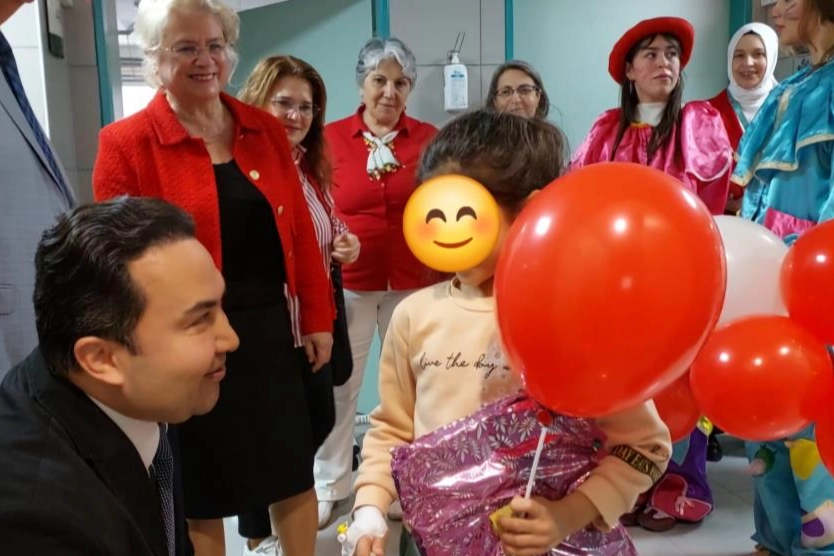 Önce, Bursa Yüksek İhtisas Eğitim ve Araştırma Hastanesi'ne giden koro üyeleri,23 Nisan için bayrak ve balonlarla donatılmış, palyaçolarında yer aldığı çocuk kliniğinde her yaşta yatan çocukları Başhekim Doç. Dr. Mehmet Oğuzhan Ay, Başhekim Yardımcısı Uzm. Dr. Muhammed Arap ve Sağlık Bakım Hizmetleri Müdürü Medine Seymen Aybey ile birlikte tek tek ziyaret ederek yaşlarına uygun oyuncak, giyim ve zeka oyunları armağan etti. 23 Nisan Ulusal Egemenlik ve Çocuk Bayramlarını kutladı.