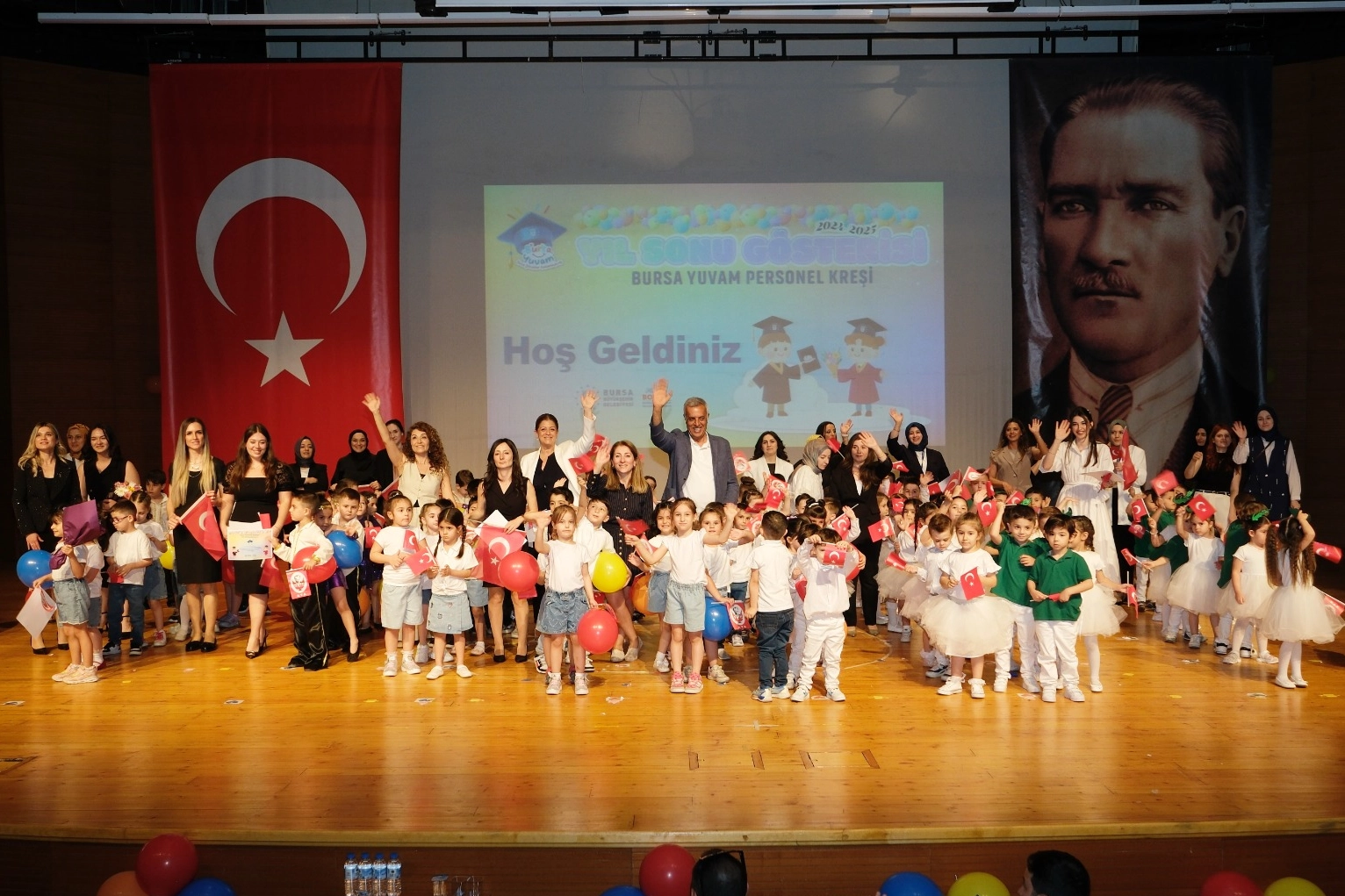 Bursa Büyükşehir Belediyesi tarafından ‘Önce Çocuklar Gülümseyecek’ temasıyla hayata geçirilen Bursa Yuvam Çocuk Eğitim Merkezleri, toplam 30 şubesinde 3600 öğrenci ile eğitim-öğretim yılını tamamlıyor. Büyükşehir Belediyesi çalışanlarının çocuklarının eğitim aldığı Bursa Yuvam Personel Kreşi’nde yıl sonu gösterisi yapıldı. Atatürk Kültür Merkezi Merinos Yerleşkesi’ndeki gösteride, 4-6 yaş arasındaki öğrenciler performanslarıyla ailelerine büyük mutluluk yaşattı.