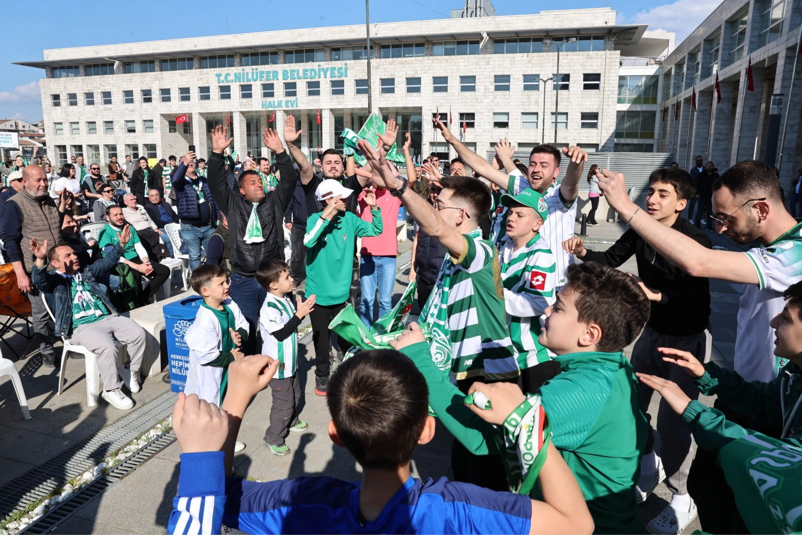 TFF Nesine 2. Lig’de şampiyonluk düğümünün çözüldüğü müsabaka, Nilüfer Belediyesi’nin organizasyonuyla Halk Evi önündeki Cumhuriyet Meydanı’na taşındı. “Omuz Omuza Zafer Yolu” sloganıyla düzenlenen etkinlikte 7’den 70’e yüzlerce yeşil beyazlı takımın sevdalısı tarihi ana tanıklık etti.