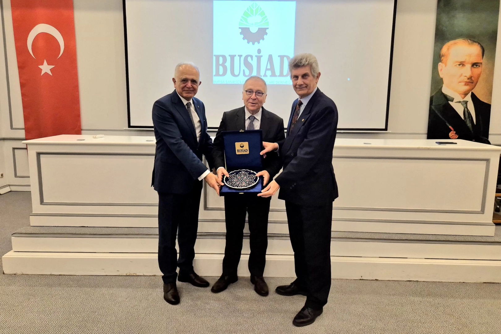 Seçimin ardından yeni BUSİAD YDK Başkanı Buğra Küçükkayalar ile BUSİAD Yönetim Kurulu Başkanı Tuncer Hatunoğlu, Ergun Hadi Türkay’a anı tabağı hediye ettiler.