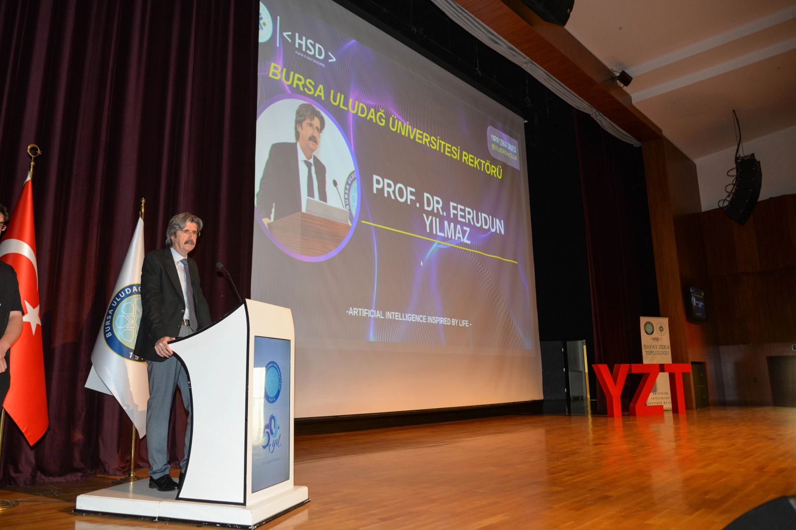 Gençleri nitelikli bir organizasyon düzenlemeyi başardıkları için tebrik eden Rektör Yılmaz; “Yapay zekâ; bir ucu ütopya, bir ucu distopyadan oluşan geniş hayat yelpazesinin her iki tarafına da hizmet etme potansiyeline sahip olan oldukça geniş bir alan. Böylesine kapsamlı bir teknolojiyi insanlık lehine, olumlu tarafa doğru kullanmak gerekiyor” ifadelerini kullandı.