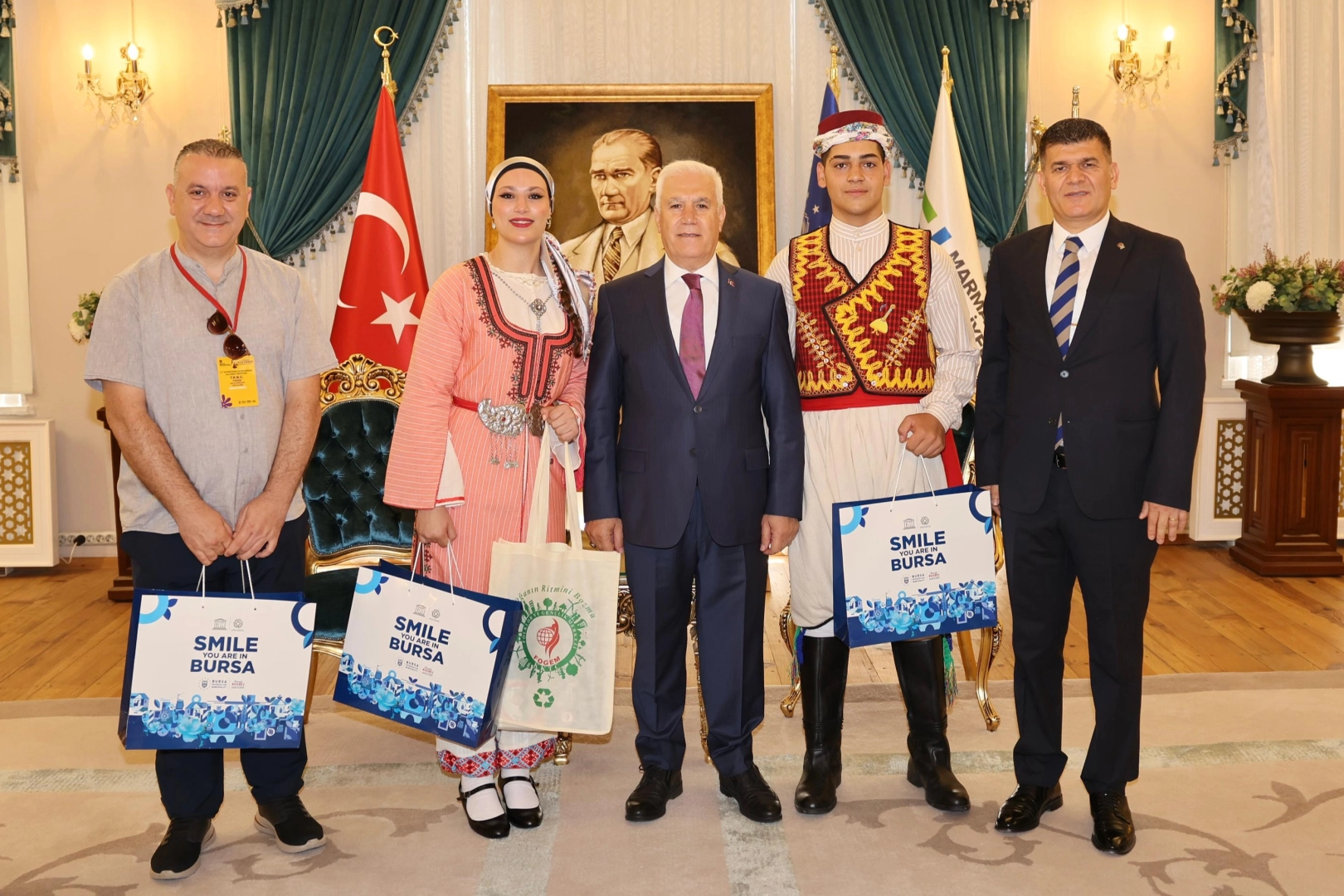 Bursa Büyükşehir Belediyesi adına Bursa Kültür Sanat ve Turizm Vakfı (BKSTV) tarafından düzenlenen 37. Uluslararası Altın Karagöz Halk Dansları Yarışması'na katılan ülkelerin temsilcileri ve yarışmanın jüri üyeleri, Bursa Büyükşehir Belediye Başkanı Mustafa Bozbey’i Tarihi Belediye Binası’nda ziyaret etti. Arjantin, Bulgaristan, Çin, Güney Kore, Gürcistan, İspanya, Kazakistan, Kuzey Kıbrıs Türk Cumhuriyeti, Kolombiya, Kuzey Makedonya, Meksika, Mısır, Panama, Porto Riko, Rusya, Yunanistan’dan gelen ekiplerin yanı sıra 25 yerel halk dansları topluluğunun temsilcileri de ziyarette yer aldı. Büyükşehir Belediyesi Genel Sekreteri Doç. Dr. Ergül Halisçelik, genel sekreter yardımcıları ve BKSTV Genel Sanat Yönetmeni Şinasi Pala’nın da yer aldığı ziyarette, Başkan Bozbey misafir ekiplerle samimi bir ortamda sohbet etti.