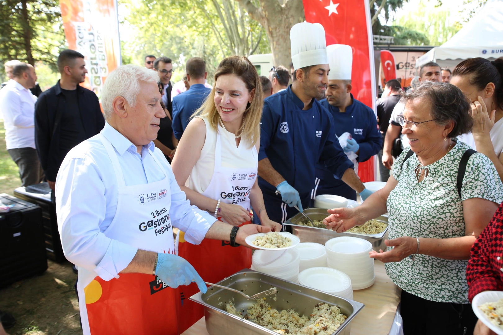 Bursa’nın zengin mutfak kültürünü turizme kazandırmak amacıyla Büyükşehir Belediyesi tarafından ‘Damağımdaki Bursa’ temasıyla düzenlenecek olan 3. Gastronomi Festivali’ne 13-14-15 Eylül tarihlerinde Merinos Park ev sahipliği yapacak. Bu yıl uluslararası katılımla gerçekleşecek festival; konserler, yarışmalar, ünlü şeflerle söyleşiler gibi birbirinden renkli içeriklerle Bursalılara unutulmaz bir deneyim yaşatacak. Festival öncesinde Bursa’nın lezzetlerini ilçelerle buluşturmak ve Bursalıları festivale davet etmek amacıyla Büyükşehir Belediyesi iştiraklerinden Kültür AŞ tarafından hazırlanan ‘Gastronomi Tırı’, bugüne kadar Osmangazi, Mustafakemalpaşa, Nilüfer, Keles, Orhangazi, Karacabey, İnegöl, Orhaneli ve Gürsu’ya uğradı. Bursa Büyükşehir Belediye Başkanı Mustafa Bozbey ve eşi Seden Bozbey de Botanik Park’ta Gastronomi Tırı’na konuk oldu. Şef Dr. Esat Özata ile birlikte şef önlüklerini giyerek mutfağa giren Başkan Bozbey ve eşi, tüm malzemeleri Bursa'da yetiştirilen ve üretilen ürünleri kullanarak kestaneli mücver yaptı. Bursalıların yoğun ilgi gösterdiği programda, Başkan Bozbey tarafından kestaneli mücverin püf noktaları da anlatıldı. Programa, Büyükşehir Belediyesi Genel Sekreter Yardımcısı Mehmet Yıldız, Dış İlişkiler Dairesi Başkanı Pınar Işıkyıldız, BURFAŞ Yönetim Kurulu Başkanı Yalçın Işıkyıldız, Kültür AŞ Genel Müdürü Yankı İçöz ve belediye bürokratları da katıldı.