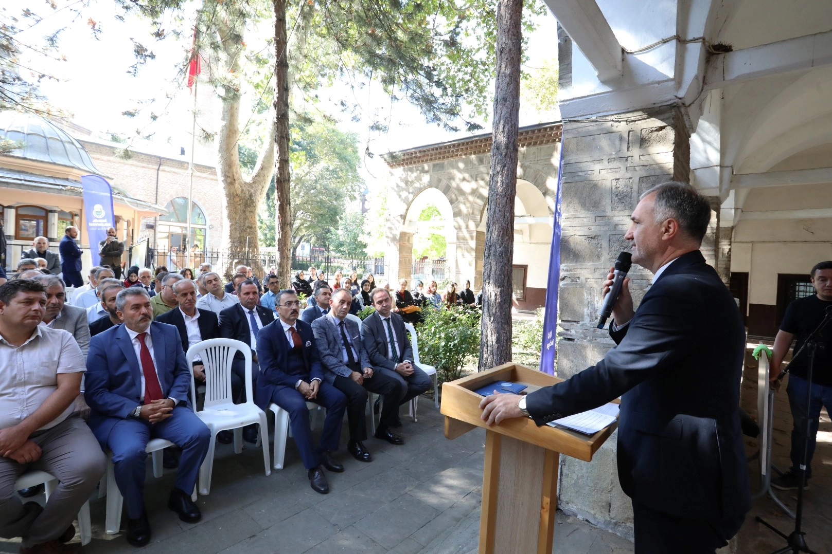 Son olarak kürsüye çıkan Eren Arslan ise “2023-24 eğitim öğretim yılımızın hayırlı uğurlu olmasını temenni ediyorum. Bugün burada bu ulu çınarların gölgesinde ilk dersimizi yapıyoruz. Ders sadece öğrenciler için değil, hepimiz için. İnsan hayatı boyunca öğrenci. Her gün yeni bir şey öğreniyor. Yeni bir şey öğrenirken de tarih bilmek çok daha kıymetli. Tarihi bilirseniz; tarihin bize sunduğu iki imkan var. Birincisi geçmişinizi bilip geçmişinizde yaptığınız iyi, güzel doğru şeylerle övünmek. Oradan aldığınız güçle geleceğe umutla bakmak. İkinci güzel imkan da ders almak. Sadece akademik bir ders olarak bakmayın tarihe. Tarihi içinde yaşayarak öğrenmeye çalışın. Biz savaş meydanlarında cengaver bir milletiz. Ancak sadece savaşmadık. Biz ilim de öğrettik, kültür de öğrettik, insanlığa yol verecek değerleri de ürettik. Bizim milletimiz böyle bir millet” diye konuştu.