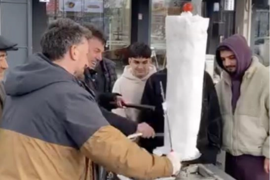 Bursa'nın İnegöl ilçesinde bir döner ustası, kar yağışını fırsata çevirerek dikkat çeken bir etkinliğe imza attı. Döner şişine kar kütlesi takan usta, iş yerinin önünde vatandaşlara "kardan döner" ikram etti.