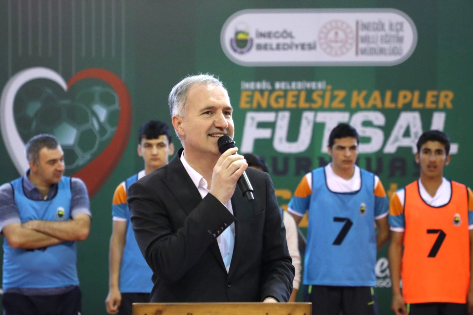 Engelsiz Kalpler Futsal Turnuvası İnegöl Belediye Spor Salonunda gerçekleştirildi. İnegöl Belediyesi Engelsiz Sosyal Yaşam Merkezi, Talha Ömer Faruk Teşik Özel Eğitim Uygulama Okulu 2. Kademe, İnegöl Belediyesi Özel Uygulama Okulu 3. Kademe, Halk Eğitim Merkezi 23 Yaş Üstü Kurs Merkezi ve Ömer Osman Çağlayan Özel Eğitim Okulu olmak üzere 5 takımın mücadele ettiği turnuvada, başlangıç vuruşunu Kaymakam Eren Arslan ile Belediye Başkanı Alper Taban yaptı. Her takım 6’şar kişiden oluştuğu turnuvada, müsabakalar büyük heyecana sahne oldu. 5 takım arasında toplam 4 müsabaka oynandı. Kıyasıya rekabetin yaşandığı maçların tamamlanmasının ardından, engelli öğrenciler için ödül töreni yapıldı. Turnuvayı İnegöl Engelsiz Yaşam Merkezi kazansa da tüm engelli bireylere kupa takdim edildi.