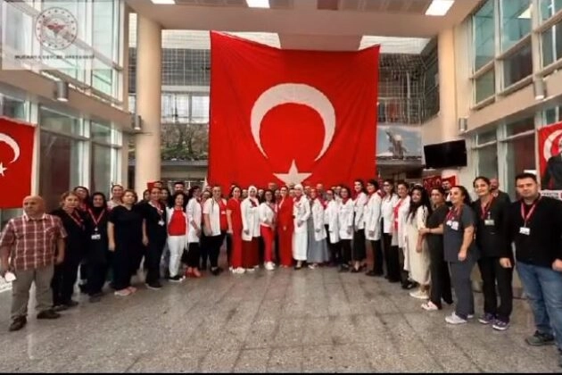 Mudanya Devlet Hastanesi de yönetim kadrosu, sağlık çalışanları ve personellerinin katıldığı, dev Türk Bayrağı’nın asıldığı hastane içindeki alanda yapılan kutlama ile Cumhuriyet’in 100’ncü yaşı kutlandı.