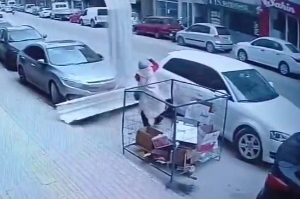 Olay anı çevredeki iş yerlerinin güvenlik kameralarına yansıdı. Görüntülerde kaldırımda yürüyen kadının, düşen çatı parçalarını son anda fark ederek kenara çekildiği ve büyük bir tehlikeyi ucuz atlattığı görülüyor. Yaşanan talihsiz olayda şans eseri yaralanan olmazken, araçta maddi hasar meydana geldi. Çevredeki vatandaşlar, bölgedeki eski yapılara dikkat çekerek, özellikle rüzgarlı havalarda can ve mal güvenliğinin tehlikeye atıldığını dile getirdi.