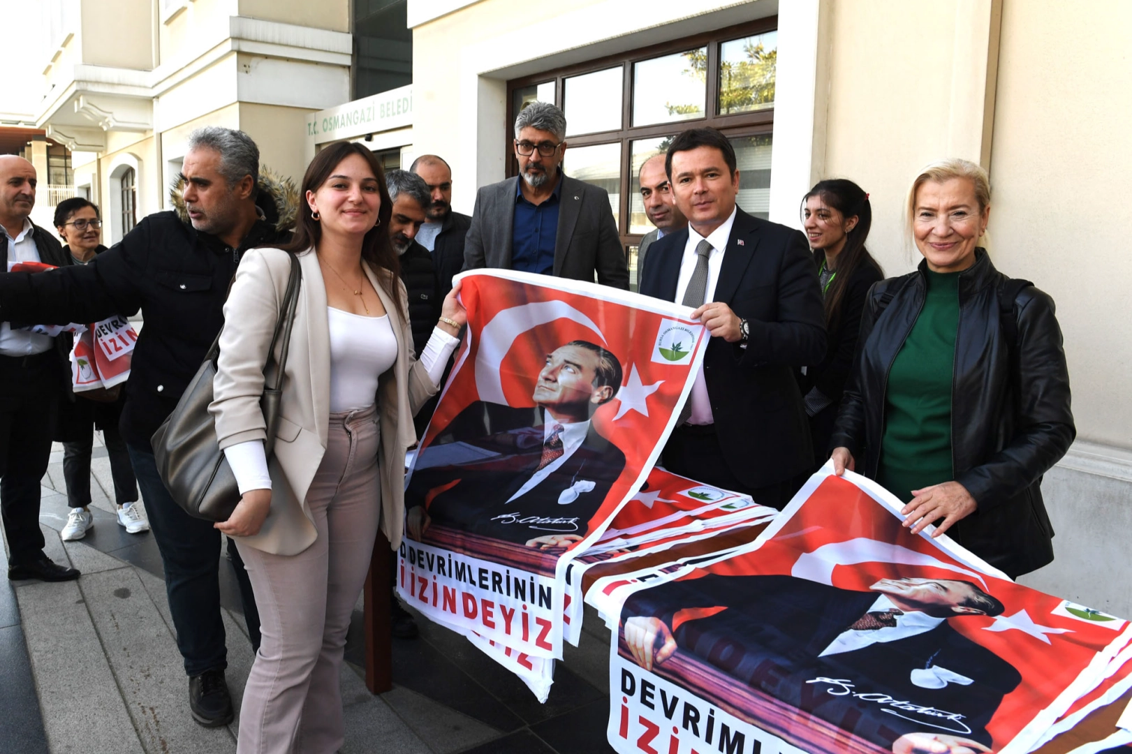 Osmangazi Belediyeye Başkanı Erkan Aydın, Osmangazi Belediyesi merkez binası önündeki dağıtım noktasına gelen vatandaşlara Ata Posteri hediye etti. Cumhuriyetin 101’inci yılını coşku içerisinde kutlamak için hazırlıkları tamamladıklarını ifade eden Başkan Aydın, “Hazırladığımız etkinliklerin yanı sıra Osmangazi’yi Ata Posterleri ile donatarak bayramı en güzel şekilde kutlayacağız. Osmangazi’de oturan yurttaşlarımızı ev ve işyerlerine Ata Posteri asmaya davet ediyorum. 27 Ekim Pazar günü Osmangazi Meydanı’nda Emir Can İğrek konseri düzenliyoruz. Büyük Önder Mustafa Kemal Atatürk’ün Cumhuriyeti emanet ettiği gençlerimizi konsere bekliyoruz. Tüm halkımızın 29 Ekim Cumhuriyet Bayramı şimdiden kutlu olsun” diye konuştu.