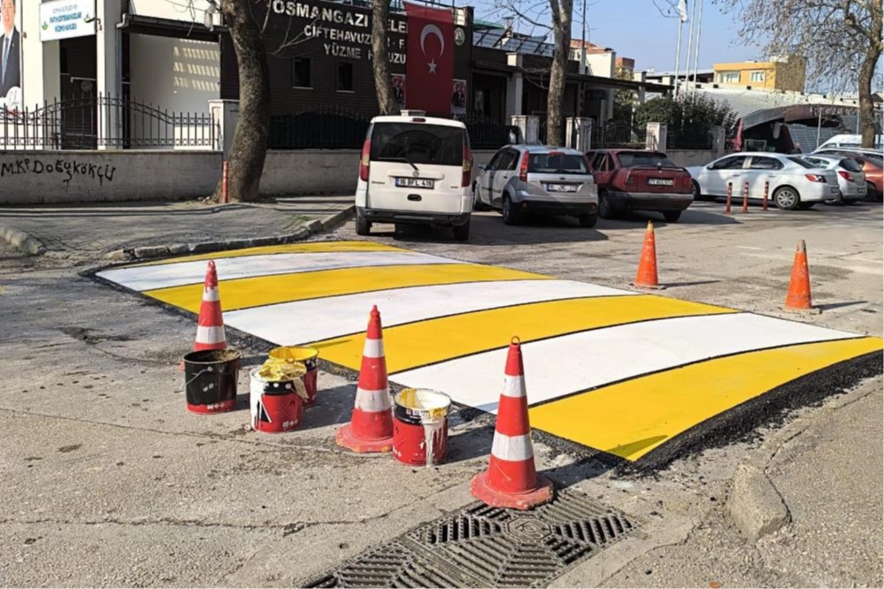 Osmangazi Belediyesi, ilçe genelinde trafik güvenliğini artırmak hedefiyle okul önlerinde ve muhtelif cadde ile sokaklarda hız kesici kasis ve şerit çalışması gerçekleştirdi.