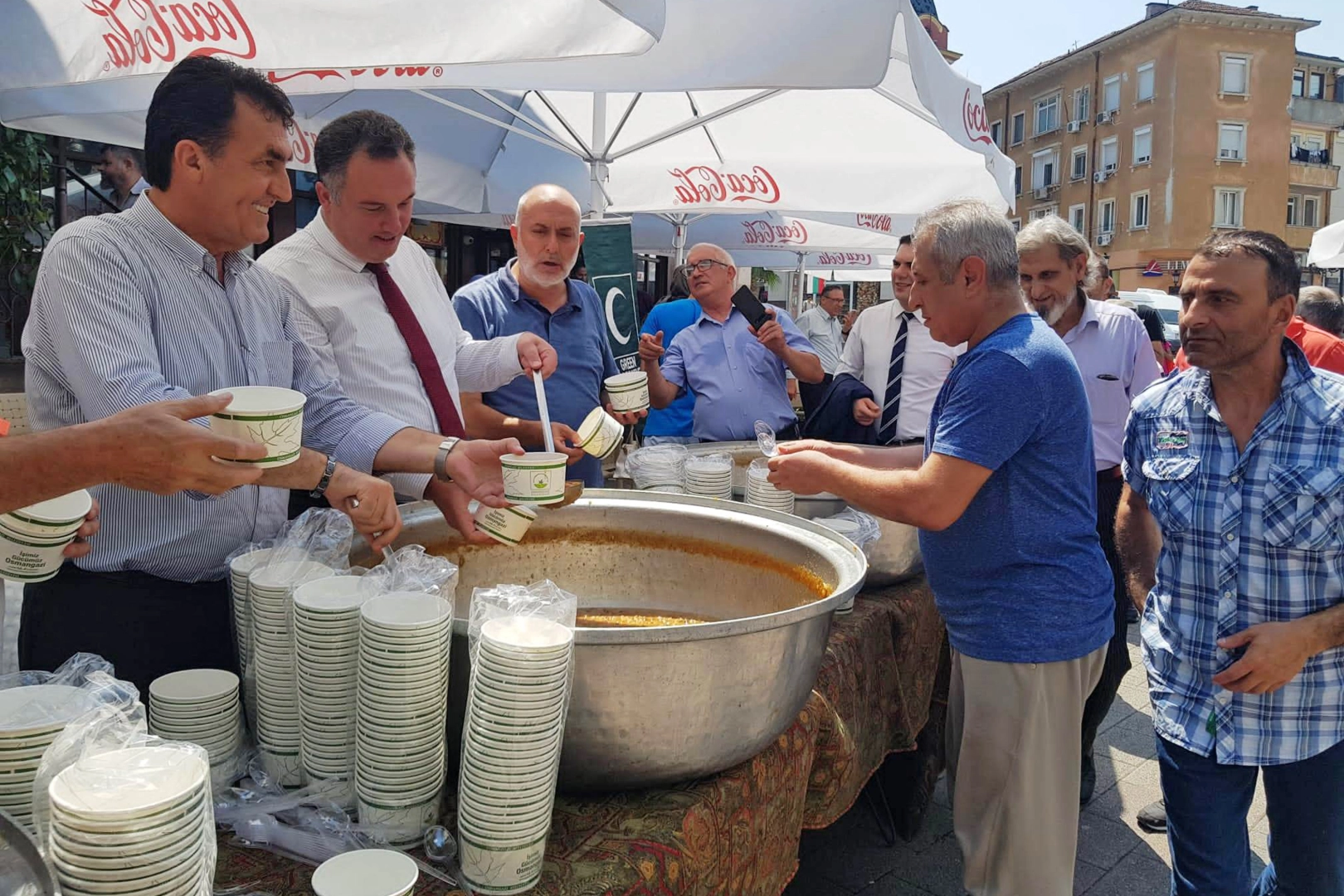 Başkan Dündar, sünnet şöleninin ardından Filibe Muradiye Camii’nde kılınan cuma namazının ardından aşure ikramında bulundu. Filibe Bölge Müftülüğü ve Muradiye Camii Başkanlığı işbirliğinde düzenlenen programda Başkan Dündar, Filibe Başkonsolosu Korhan Küngerü ile birlikte kazanların başına geçerek aşure dağıttı.