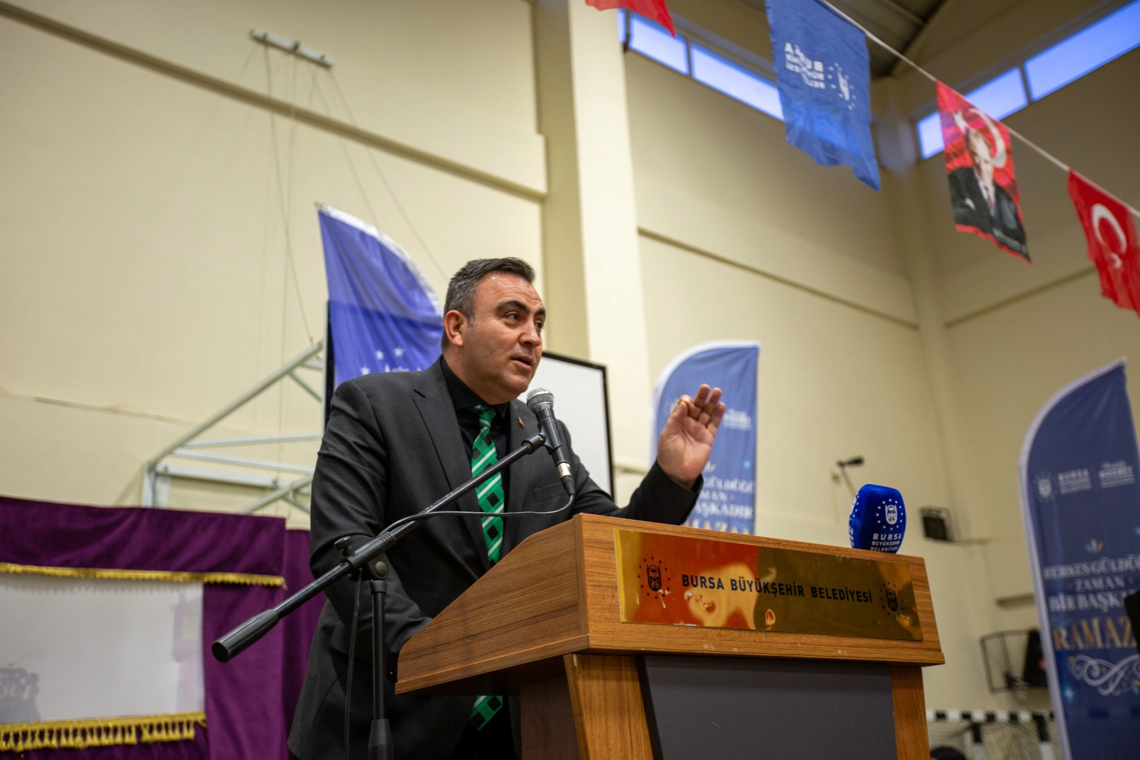 Bursa Büyükşehir Belediyesi tarafından düzenlenen geleneksel iftar programları, Keles ilçesi ile devam etti. Keles Kapalı Spor Salonu’ndaki programa, Bursa Büyükşehir Belediyesi Başkanvekilleri Mehmet Aydın Saldız ve Mustafa Orkun Gazioğlu, CHP Keles İlçe Başkanı Cevat Acar, Tarım Peyzaj AŞ Genel Müdürü Sedat Akar, Büyükşehir Belediyesi bürokratları, muhtarlar, belediye meclis üyeleri ve vatandaşlar katıldı. Orkestra Şube Müdürlüğü tarafından verilen mini konserin ardından akşam ezanının okunmasıyla birlikte vatandaşlar oruçlarını açtı. Bursa Büyükşehir Belediyesi Başkanvekili Mehmet Aydın Saldız, Büyükşehir Belediye Başkanı Mustafa Bozbey’in selamlarını ileterek Ramazan ayının hayırlı olmasını diledi. Birliğin, beraberliğin ve dayanışmanın en güzel yaşandığı aylardan olan Ramazan ilçeye ve Bursa’ya huzur ve bereket getirmesini dileyen Saldız, oruç tutmanın sadece aç kalmak olmadığını, yalan söylememek, iftira atmamak, hakka ve hukuka riayet etmek demek olduğunu da vurguladı. CHP Keles İlçe Başkanı Cevat Acar, iftar programı dolayısıyla Bursa Büyükşehir Belediyesi’ne teşekkür etti. İftarın ardından düzenlenen Karagöz Gölge Oyunu gösterisi, çocuklara keyifli anlar yaşattı. Teravih namazı sonrasında ise Epçeler Köyü ve Baraklı Köyü camilerinde vatandaşlara tatlı ikramında bulunuldu.