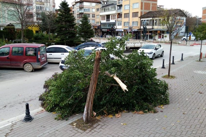 Olay, saat 12.00 sıralarında Sinanbey Mahallesi Yenişehir caddesinde meydana geldi. Şiddetli lodosa dayanamayan ağaçta ortadan ikiye ayrılarak devrildi. Olay yerine gelen belediye ekipleri ağacı yoldan kaldırdı.
