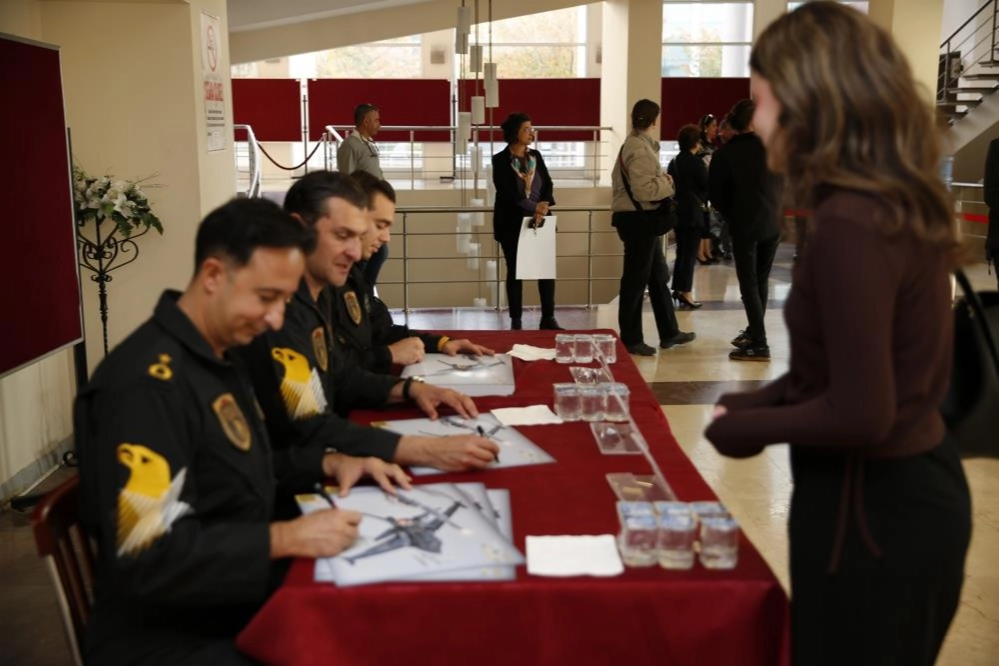 ESOGÜ Kongre ve Kültür Merkezi'ndeki etkinliğe ESOGÜ Rektör Yardımcıları Prof. Dr. Emine Gümüşsoy ve Prof. Dr. Hakan Demiral, Rektör Danışmanı Doç. Dr. Y. Murat Bulut ve diğer yöneticiler ile öğrenciler ve üniversite personeli katıldı. Etkinlik açılışında konuşan ESOGÜ Sanat ve Tasarım Fakültesi Dekanı Prof. Dr. Şirin Şengel, SOLOTÜRK'ün Türk milletinin gökyüzündeki gücünü, özgüvenini ve estetik duyarlılığını; Türk Hava Kuvvetleri'nin cesaretini, disiplinini ve mükemmelliğe olan tutkusunu temsil ettiğini belirtti. Şengel, SOLOTÜRK'ün gökyüzünü bir tuval, F-16 uçağını bir fırça gibi kullanarak izleyenlerde hayranlık ve gurur uyandıran benzersiz bir hava sanatı gösterisi sergilediğini kaydetti. Prof. Dr. Şengel, SOLOTÜRK'ün yalnızca bir gösteri ekibi değil bilimin, sanatın ve tasarımın birleşiminden doğan çağdaş bir estetik anlayışının temsilcisi olduğunu ifade etti. Sanat ve Tasarım Fakültesi olarak geçtiğimiz yıl Kasım ayında, Türk havacılık tarihinde iz bırakan F-4 Phantom savaş uçağının Türk Hava Kuvvetleri envanterine girişinin 50. yılı anısına özel bir boyama tasarımı gerçekleştirdiklerini hatırlatan Prof. Dr. Şengel, bu değerli çalışmanın ulusal belleğimizde yer edinen bir tasarım başarısı olarak ESOGÜ Sanat ve Tasarım Fakültesi'nin gurur kaynağı olduğunu dile getirdi. Prof. Dr. Şirin Şengel, ülkemize yaşattıkları gurur ve ilham için SOLOTÜRK gösteri ekibine ESOGÜ ve Sanat ve Tasarım Fakültesi adına teşekkür ederek konuşmasını tamamladı. Açılış konuşmasının ardından SOLOTÜRK ekip lideri ve 1. gösteri pilotu Hv. Plt. Yb. Murat Bakıcı ve 2. gösteri pilotu Hv. Plt. Bnb. M. Erhan Aydemir sunumlarını gerçekleştirirken, SOLOTÜRK Basın ve Halkla İlişkiler ekibinden Hv. Ütğm. Alper Şen de etkinliğe katıldı. Kendilerini tanıtan pilotlar sonrasında SOLOTÜRK ekibi, SOLOTÜRK uçağının özellikleri ve tasarımı, gösterilerde sergiledikleri hareketler ve nasıl SOLOTÜRK pilotu olunabileceği hakkında bilgiler verdiler. SOLOTÜRK'ün Türkiye Cumhuriyeti devletinin gücünü gösterdiğini vurgulayan Hv. Plt. Yb. Murat Bakıcı, SOLOTÜRK gösteri ekibinin pilotlarının aktif savaş pilotu olmasıyla dünyadaki benzerlerinden ayrıldığını kaydetti. Hv. Plt. Yb. Murat Bakıcı dünyanın her tarafına gösteriler sergilemek için gittiklerini ve oralardaki özgüvenlerinin ve maneviyatlarının asil Türk milletini temsil etmekten geldiğini ifade etti. Soru-cevap bölümü ve teşekkür belgesi takdimi ile tamamlanan söyleşinin ardından, Hv. Plt. Yb. Murat Bakıcı, Hv. Plt. Bnb. M. Erhan Aydemir ve Hv. Ütğm. Alper Şen fuaye alanında ESOGÜ öğrencileri ile imza etkinliğinde bir araya geldi.
