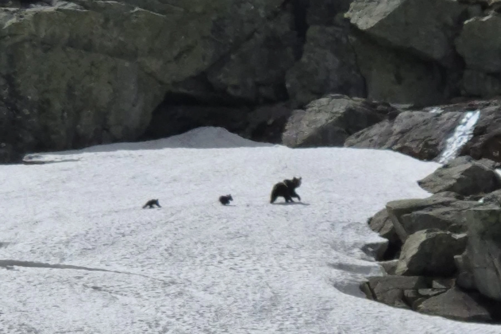 Mevsimlerin kayması sebebiyle havaların geç ısındığı hatta karın hala erimediği zirvede kış uykusunu tamamlayıp kaldıkları mağaradan çıkan anne ayı ve 2 yavrusu yiyecek ararken görüntülendi. Ayı ailesi bir süre sonra gözden kayboldu.