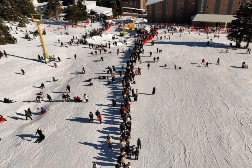 Kayak yapmak için telesiyej sırası bekleyen binlerce kişinin zirveye doğru uzanan kuyruk görüntüsü gökyüzünden bakılınca tabloları aratmadı.