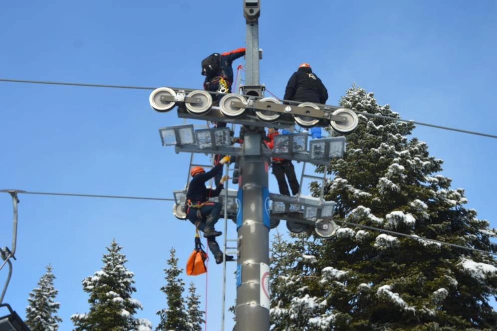 Bursa'da AFAD ve JAK ekipleri, Uludağ'da gerçekleştirdikleri kurtarma tatbikatında yürekleri ağza getirdi. Uludağ'ın karla kaplı bölgesinde 35 AFAD ve 2 tim JAK ekibi, duran telesiyejdeki kişileri sağlıklı bir şekilde yere indirmek için akrobatları aratmayacak şekilde tellerde ilerledi. Mahsur kalanlara ulaşan ekipler, onları sağlıklı bir şekilde indirmek için gereken bütün önlemleri aldı.