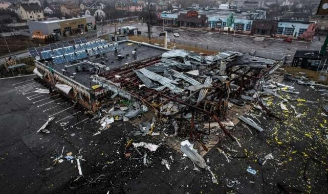 İstasyonun çevresinde bulunan market ve restoran da harabeye döndü. Yaşanan çatışmalardan sonra Ukrayna ordusunun kontrolü yeniden sağladığı bölgede büyük yıkım meydana geldiği göze çarptı.