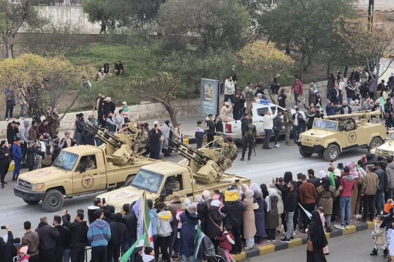Suriye bayraklarıyla geçit törenini izleyen binlerce Suriyeli, sloganlar atarak zaferi kutladı. Töreni Suriyelilerin yanı sıra Devlet Başkanı Ahmed Eş-Şara, Suriye Dışişleri Bakanı Esad Hasan Şeybani, çok sayıda bakan ve askeri komutan izledi.