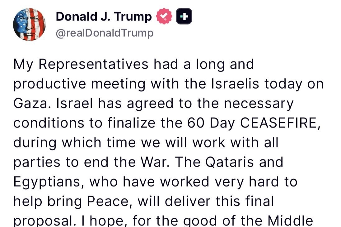 İsrail’in Orta Doğu'daki katliamları sürerken, ABD Başkanı Donald Trump’tan Gazze’de olası ateşkese dair kritik bir açıklama geldi. Kendisine ait Truth sosyal medya platformu üzerinden paylaşım yapan Trump, "Temsilcilerim bugün Gazze konusunda İsraillilerle uzun ve verimli bir toplantı yaptı. İsrail, 60 günlük ateşkesi kesinleştirmek için gerekli koşulları kabul etti" ifadelerini kullandı. Bu süre zarfında tüm taraflarla birlikte savaşın sona erdirilmesi için çalışacaklarını kaydeden Trump, "Barışın sağlanması için çok çaba harcayan Katar ve Mısır, bu nihai teklifi sunacak. Hamas, Orta Doğu’nun iyiliği için umarım bu anlaşmayı kabul eder. Çünkü aksi daha iyi olmayacak. Sadece daha kötü olacak" dedi.