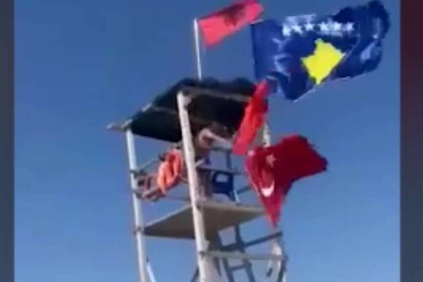 Dıraç kentine bağlı Gjiri i Lalzit Plajı'ndaki gözetleme kulesinde bulunan Türk bayrağını indiren şahıs bayrağı denize attı.