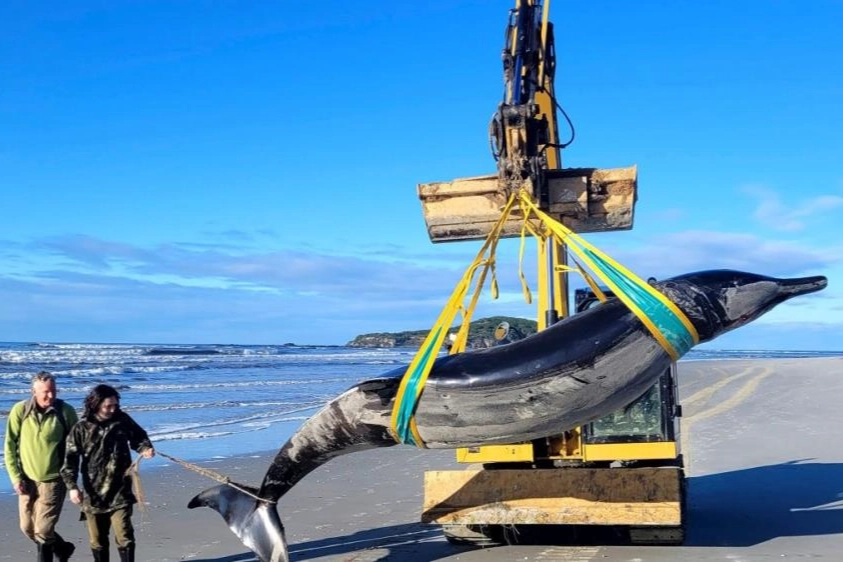 Karaya vuran balina uzmanlar eşliğinde iş makinesi ile sahilden alınarak, sonraki adımlara karar verilinceye kadar korunmak üzere soğuk hava deposuna taşındı. DOC tarafından yapılan açıklamaya göre balinadan alınan örnekler, Auckland Üniversitesi'ne gönderildi. Balinanın türünü doğrulamak için yapılacak DNA incelemesinin birkaç hafta veya ay sürebileceği kaydedildi.