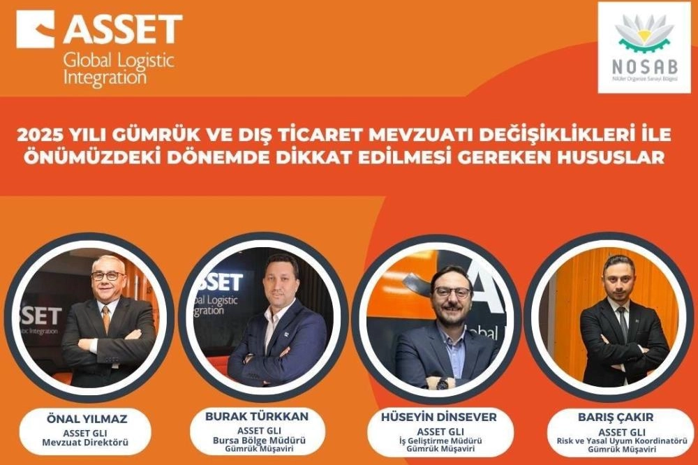Asset Global Logistic Integration (GLI) ve NOSAB iş birliğiyle düzenlenen etkinlik, 15 Ocak Çarşamba günü, 13.30-16.30 saatleri arasında, NOSAB Yalçın Aras Konferans Salonu'nda gerçekleştirilecek. Konferansta, mevzuat değişikliklerinin yanı sıra yeşil mutabakat ve karbon ayak izi ile tedarik zincirinde maliyet azaltıcı gümrük uygulamaları masaya yatırılacak. Etkinlikte Asset GLI Mevzuat Direktörü Önal Yılmaz, Bursa Bölge Müdürü Burak Türkkan, İş Geliştirme Müdürü Hüseyin Dinsever ile Risk ve Yasal Uyum Koordinatörü Barış Çakır konuşmacı olarak yer alacak. Katılımcılar, güncel mevzuat değişiklikleri hakkında bilgi edinme fırsatı bulurken, dış ticaret ve lojistik süreçlerinde yeni stratejiler geliştirme imkanı yakalayacak.