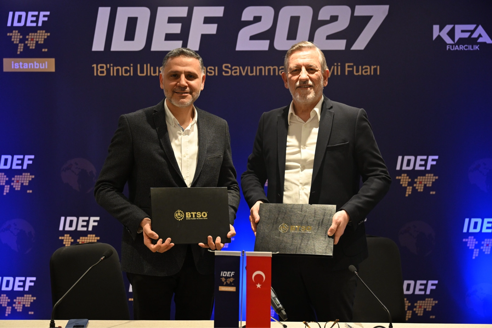 Millî Savunma Bakanlığı ev sahipliğinde, Cumhurbaşkanlığı Savunma Sanayii Başkanlığı destekleri ve Türk Silahlı Kuvvetlerini Güçlendirme Vakfı (TSKGV) yönetim ve sorumluluğunda Mayıs 2027’de İstanbul Fuar Merkezi’nde düzenlenecek olan IDEF 2027’nin organizasyonuna ilişkin protokol, BTSO’nun referans eğitim merkezi Bursa Business School’da gerçekleştirilen törenle imzalandı. TSKGV Genel Müdürü Bilal Topçu ile BTSO ve KFA Yönetim Kurulu Başkanı İbrahim Burkay arasında imzalanan protokol ile BTSO iştiraki olan KFA Fuarcılık geçtiğimiz yıl olduğu gibi bu büyük fuarın organizasyonunu üstlenecek. “IDEF, Küresel Savunma Sanayii Ekosisteminin En Güçlü Buluşma Noktalarından Biri”