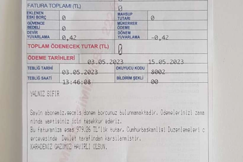 "Bu faturanın esas bedeli ... liralık tutar Cumhurbaşkanlığı düzenlemeleri çerçevesinde devlet tarafından karşılanmıştır. Karadeniz gazımız hayırlı olsun."