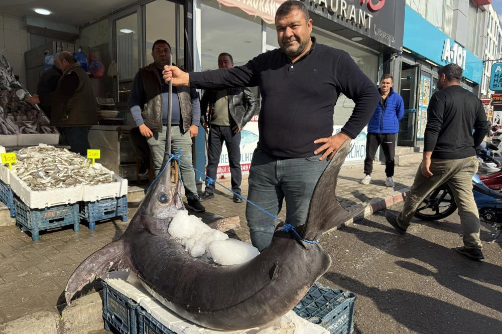 Balıkçı Sami Bülbül, devasa kılıç balığının Dörtyol açıklarında yakalandığını belirterek, "Akdeniz sularının en büyük balığı bizde. Tam tamına 138 kilogram kılıç balığı. Dörtyol açıklarında yakalandı. Yaklaşık 3 metre uzunluğa sahip, devasa maşallah. Akdeniz'in en büyük balığı ve sardalya sürüsü içinde yakalandı. Büyük balıklar, küçük balıkları sahile sürüyor" dedi.
