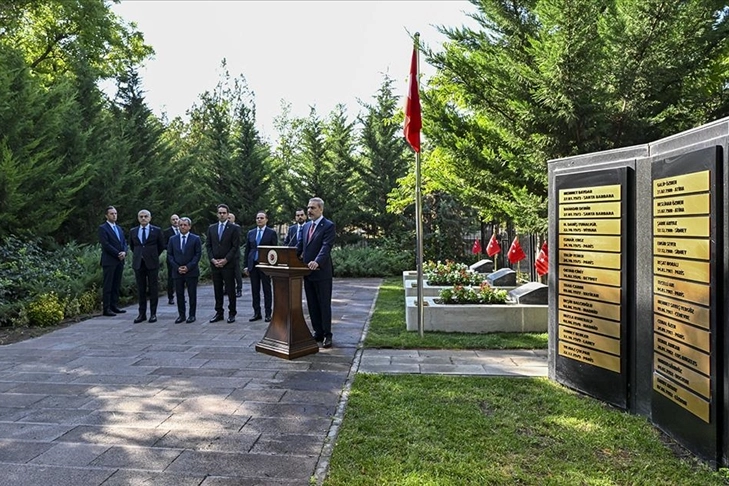 Saygı duruşuyla başlayan törende konuşan Fidan, "Türk milletinin tarihi, vatan uğruna gözünü kırpmadan şehadete yürüyen kahramanlarla doludur. Bu kahramanların bir kısmı ismen bilinir, bir kısmı ise sonsuza kadar isimsiz kahramanlarımız olarak kalmaya devam edeceklerdir. 14. Büyükelçiler Konferansı vesilesiyle dünyanın dört bir yanında vatan aşkıyla hizmet ederken şehitlik mertebesine yükselen Dışişleri şehitlerimizin manevi huzuruna çıkmaktan onur duyuyorum." ifadelerini kullandı.