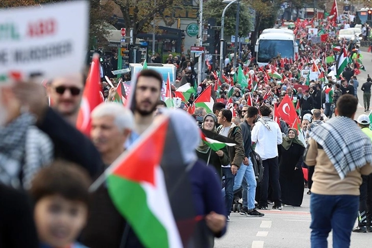 Ellerinde Türk ve Filistin bayrakları ile dövizler, omuzlarında ise kefiyeler taşıyan katılımcılar, İsrail'in saldırıları karşısında Gazze'de sürdürülen direnişe destek mesajları verdi.