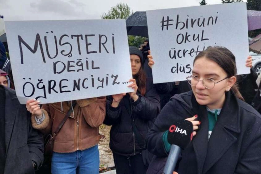Biruni Üniversitesi'nin okul ücretine yüzde 130'a varan oranda zam yapması öğrencilerin tepkisini çekti. Okulun önünde toplanan öğrenciler, zamlı fiyatları ödeyemeyeceklerini belirterek okul yönetimine çağrıda bulundu.