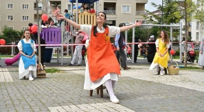 Evlerinin balkonlarından da gösteriyi izleyen minikler ve aileleri, ellerindeki Türk bayraklarını sallayarak heyecana ortak oldu. Daha sonra sahne alan Hacivat ve Karagöz orta oyunu, yaptıkları skeçlerle çocuklara kahkaha dolu dakikalar yaşattı. Ardından Büyükşehir Belediyesi Şehir Tiyatrosu, 23 Nisan coşkusunu evlerinde kutlamak zorunda kalan çocukların neşesine ortak olmak için hazırladığı 'Mevsimlerin Şarkısı' adlı çocuk oyununu sahneledi.