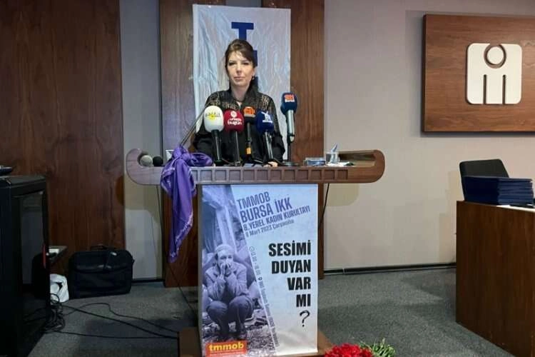 Bursa İnşaa Mühendisleri Odası Bursa Şubesi Yönetim Kurulu Başkanı Ülkü Mercan Küçükkayalar, "Kadınlar erkeklere göre daha çok etkilenmektedirler. Bu etkiler üzerinden konuya dikkat çekmek ve farkındalık oluşturmak üzere kurultayımızda konuşmacılarımız kendi deneyimlerini aktarıp katkı sunacaklar. Kurultayımız afette kadın deneyimi, afet kadın dayanışması ve afette kadın gönüllülüğü şeklinde iki başlıkta gerçekleşecek olup hüznümüzün sesi türkülerimiz dinletisiyle tamamlanacaktır. Sayın konuklar, değerli katılımcılar biz tüm kadınlar, her koşulda kadının özgürleşmesi için, kadının insan hakları için söz, yetki ve karar hakkı için, güvenliği için, yaşama hakkı için bir kadın mücadelesiyle yolumuza devam edeceğiz. Bu amaçla yaralarımızı dayanışmayla saracağız. Kadınlar örgütlü TMO daha güçlü diyerek inançla yolumuza devam edeceğiz. Güç ve kararlılıkta olduğumuzun bilinmesini istiyoruz. Kurultayımızın sonuçlarının geleceğe ışık tutacağını bilimin yoluyla hep birlikte umutlarınızı tazeleyeceğimize örgütlülüğümüzü güçlendireceğimize ve dayanışmamızı büyüteceğimize olan inancımızla yaşadığımız afetlerde kaybettiğimiz bütün meslektaşlarımızı tüm insanlarımızı tüm canlılar için üzüntümüzü bir kez daha dile getiriyor, Allah'tan rahmet diliyor ve yaralılarımıza geçmiş olsun dileklerimizi iletiyoruz. Hepinizi tekrar saygıyla, sevgiyle ve dostlukla selamlıyorum. Yaşasın TMMOB! Yaşasın kadın dayanışması!" diye konuştu.