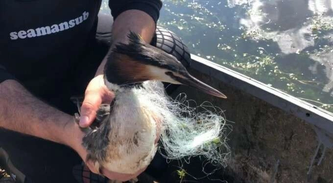 Bursa İl Jandarma Komutanlığına bağlı ekipler, Uluabat Gölü'nde devriye atarken sahipsiz ağlara takılmış Bahri Kuşu'nu fark ettiler.