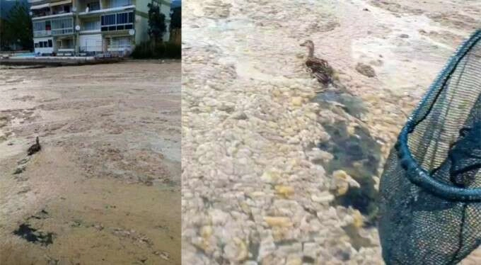 Salyaların arasında karnını doyurmaya çalışan ördeklerin, mahsur kalması vatandaşın yüreğini burktu.