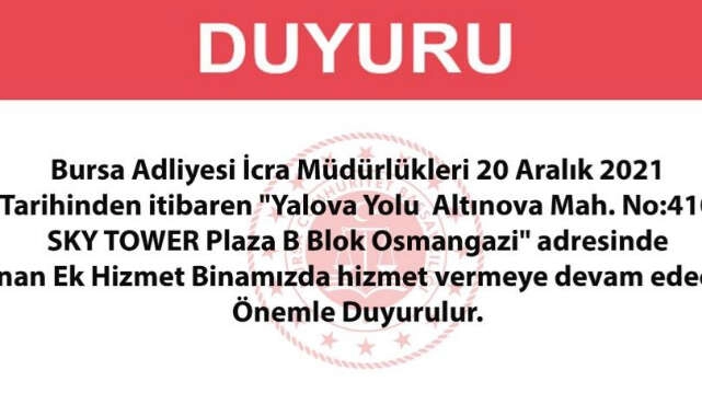 Bursa Adliyesi İcra Müdürlükleri 20 Aralık 2021 tarihinden itibaren ''İstanbul Yolu Caddesi Altınova Mahallesi Numara 410 SKY TOWER Plaza B Blok Osmangazi'' adresinde bulunan Ek Hizmet binamızda hizmet vermeye devam edecektir" ifadeleri yer aldı.