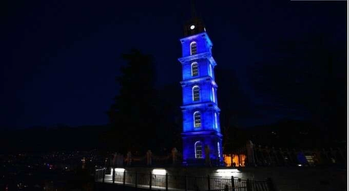 Büyükşehir Belediyesi tarafından tarihi belediye binası ile Tophane'deki saat kulesi mavi ışıkla aydınlatıldı.
