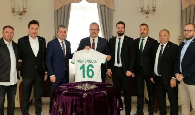 Bursaspor Kulübü’nden ziyaretle ilgili yapılan açıklamada, "Başkanımız Ömer Furkan Banaz, Futbol Şube Sorumlumuz Mehmet Zahit Yanar, Hukuk İşlerinden Sorumlu Yönetim Kurulu Üyemiz Ahmet Güngör, Bursastore'den Sorumlu Yönetim Kurulu Üyemiz Onur Özen, Amatör Branşlar ve Futbol Okulundan Sorumlu Yönetim Kurulu Üyemiz Selim Yolgeçen, Reklam ve Pazarlamadan Sorumlu Yönetim Kurulu Üyemiz Metin Alp, Yatırım ve Tesislerden Sorumlu Yönetim Kurulu Üyemiz Rıdvan Gültekin Bursa Valimiz Yakup Canbolat'ı makamında ziyaret etti.Bursa Valimiz Yakup Canbolat, takımımızın her daim yanında olduğunu belirtirken kalan maçlarımız için başarı dileklerini iletti. Başkanımız Ömer Furkan Banaz ziyaret sonunda Canbolat'a isminin yazılı olduğu beyaz formamızı hediye etti" ifadelerine yer verildi.