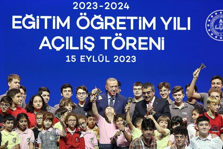 Cumhurbaşkanı Recep Tayyip Erdoğan, Atatürk Kültür Merkezi'nde düzenlenen 2023-2024 Eğitim Öğretim Yılı Açılış Töreni'nde yaptığı konuşmada, bu seneki programı tüm il ve ilçe müdürlerinin yanı sıra öğretmen ve öğrencilerin de aralarında yer aldığı geniş bir katılımla yaptıklarını söyledi.