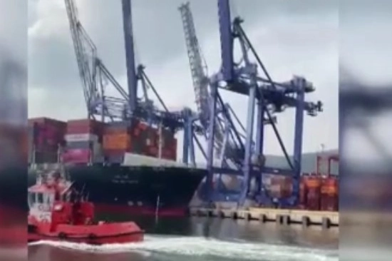 Kocaeli’nin Körfez ilçesinde bulunan Evyapport limanında gemi kıyıda bulunan vinçlere çarptı. Devasa vinçler, limanın üzerine devrildi, dehşet anları kameralar tarafından görüntülendi.