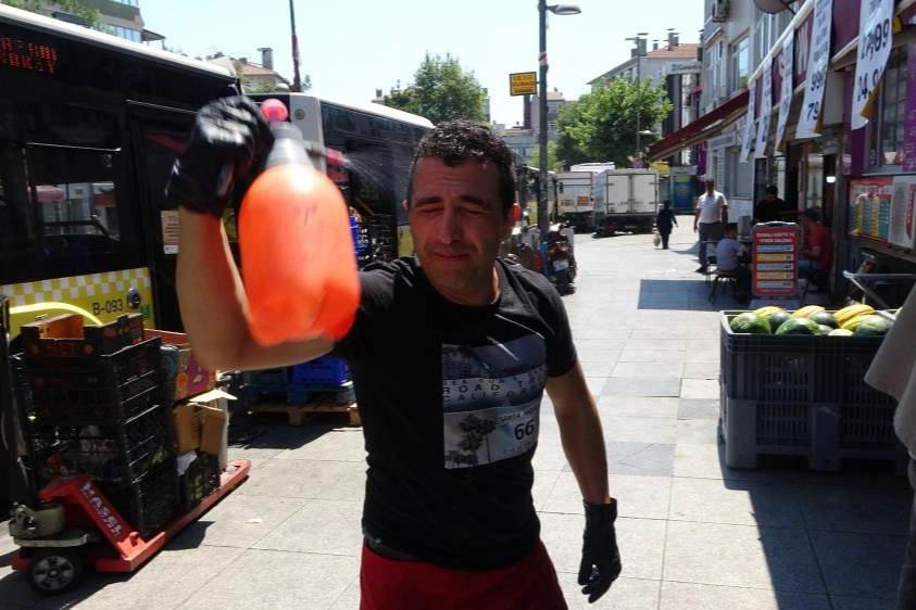 ‘’Hem ürünler hem de biz yandık’’ Fatih Kocamustafapaşa’da manav dükkanı işleten Mehmet Şavli, sıcaktan korunmak için hem kendini hem de meyvelerini suladı. Şavli, ‘’Bu sene çok sıcak, bittik, mahvolduk. 10 senedir böyle bir sıcaklık görmemiştik. Meyveler de yandı, biz de yandık. Kendimizi ıslatıyoruz. Meyveleri de yanmasın diye ıslatıyoruz. Yoksa kaynıyor. Sıcaktan meyveler dayanamıyor, çürüyor. Bu sıcaklardan dolayı ürünler de pahalanıyor. Hem ürünler hem de biz yandık’’ dedi.