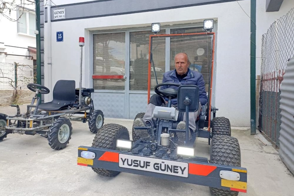 Emeklilik sonrası çalıştığı şirketindeki tamirat işlerinden sorumlu olan Güney, hem eşinin hem de patronunun desteğiyle bugüne kadar 3 adet go-kart aracı üretti. Çalıştığı şirkette 15 yıldır çalıştığını ve böyle bir sistem kurduğunu söyleyen Güney, "Bu fikir patronumun bana go-kart yapar mısın demesiyle başladı, benim de daha evvel hevesim vardı tabii. Eşimin de katkısı oldu, bir go-kart istemişti. Patronlarımızın desteğiyle başladık. 3 tane go-kart yaptım. 2 tane çıkma motoru aldım. Diğer bütün hareketli parçalarını satın aldım. Ana şaselerini kendim yaptım. Yani çoğu şeylerin kaynak işçiliğini, profil, ana gövdelerini, hepsini kendim yaptım. Sadece internetten gördüğümle yaptım. Herhangi bir makineden kopya çekerek yapmadım. Keşke görsem, daha iyisi olurdu. İlk başladığımda bunu basit bir usulde ince demirlerle yaptım, yürüttüm. Baktım iyi, randıman veriyor. Onu hurdaya ayırdım, gerekli parçalarını söktüm" şeklinde konuştu. "Büro koltuklarını kullandım"