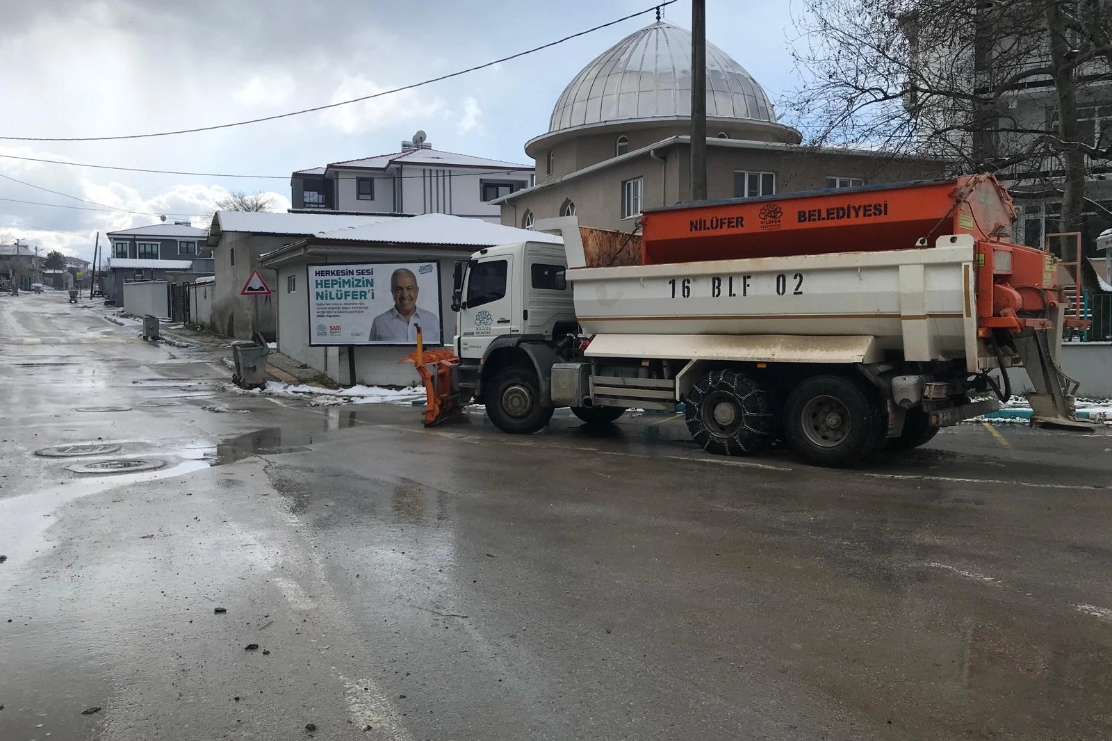 İlçe merkezinde özellikle Beşevler, Üçevler, Konak gibi mahallelerde sıcaklığın eksilere düşmesi nedeniyle buzlanan yollarda kazaların önüne geçmek için ekipler sabahın erken saatlerinden itibaren yoğun bir şekilde tuzlama çalışması yaptı.Yolların ulaşıma açık kalması için hummalı bir şekilde çalışan ekipler, 9 tuzlama ve 13 yol açma aracı ile karla mücadele ediyor. Gece-gündüz görev başında olan ekipler, vatandaşlardan gelen ihbarları da değerlendirerek gerekli müdahaleleri gerçekleştiriyor. Yapılan çalışmalar sonucunda Nilüfer'deki tüm mahalle yolları açık tutularak