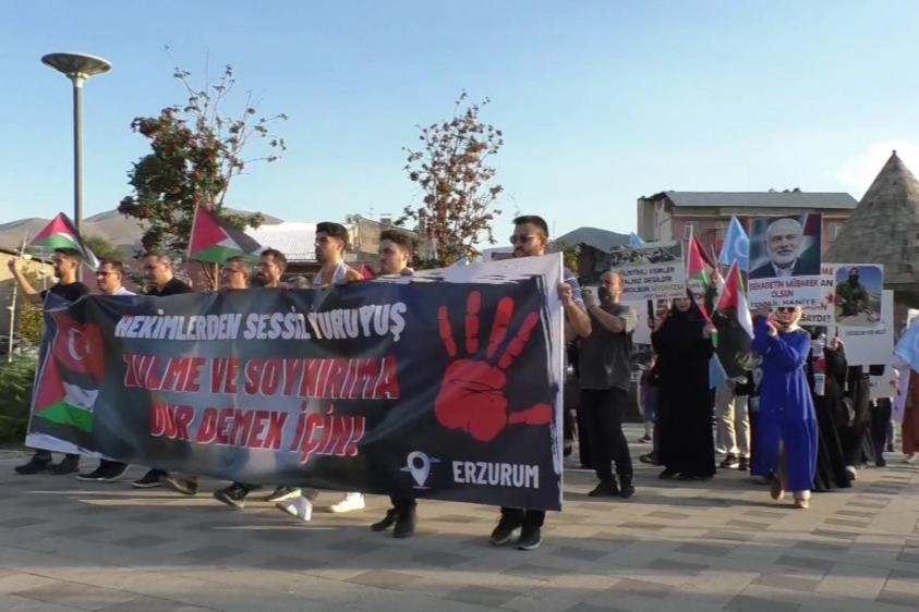 Tarihi Erzurum Kalesi etkinlik alanında bir araya gelen sağlık çalışanları, Türk ve Filistin bayrakları eşliğinde taşıdıkları döviz ve pankartlarla yürüdü. Burada grup adına basın açıklamasını İntörn Doktor Muhammet Haçyanoğlu yaptı.