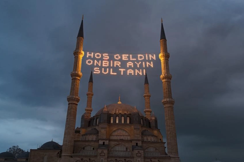 Edirne'de UNESCO Dünya Kültür Mirası Listesi'ndeki Mimar Sinan'ın 'ustalık eserim' dediği Selimiye Camii minarelerine Ramazan ayının gelişiyle asılan "Hoş geldin on bir ayın sultanı" yazılı mahya, Yunanistan'dan da görünüyor.