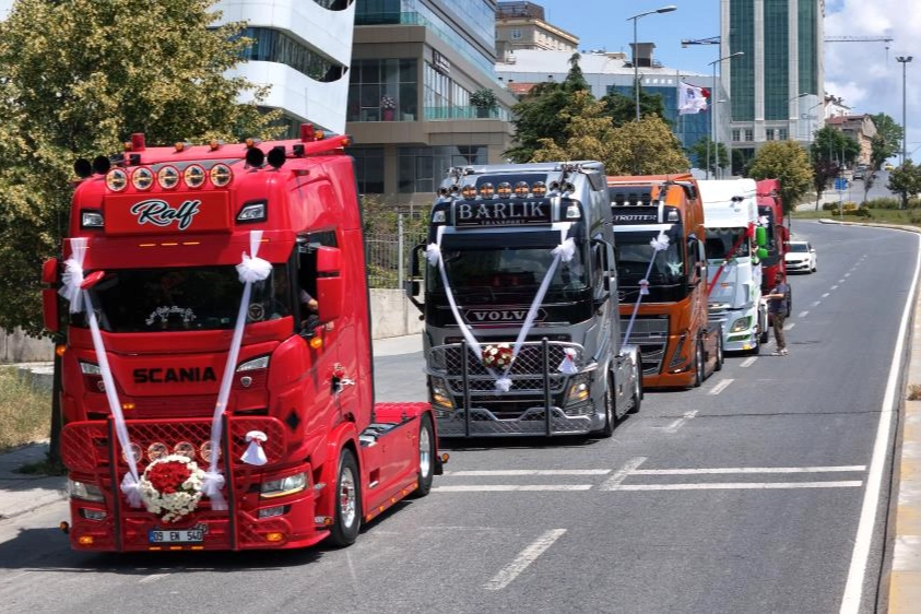 Alışılmışın dışında bir konvoy görüntüsü İstanbul Bağcılar'da kaydedildi. Lüks ve son model tırlardan oluşan düğün konvoyu görenlerin dikkatini çekti. Tır şoförü Gökhan Yıldız, gelin alma töreni için Sinem Yıldız’ın evinin önüne arkadaşları ile birlikte tır konvoyu yaparak geldi. Meşaleler ve davul zurna eşliğinde Bağcılar'daki evin önüne gelen damadın vatandaşlardan büyük ilgi gördüğü anlar havadan görüntülendi. Son model kırmızı tır ile gelin almaya gelen Gökhan Yıldız, "Biz bu işi gönül vererek severek yapıyoruz. Gönül vererek yaptığımız işi layığı ile yaptığımıza inanıyorum. Eşim de lojistik işinde çalışıyor" dedi. Konvoyu çok beğendiğini dile getiren Sinem Yıldız, "İkimiz de lojistik sektöründe çalıştığımız için eşimin böyle bir düğün konvoyu yapmak hayaliydi. Eşimin hayalinin gerçekleşmesinden dolayı mutluluk duyuyorum" dedi.